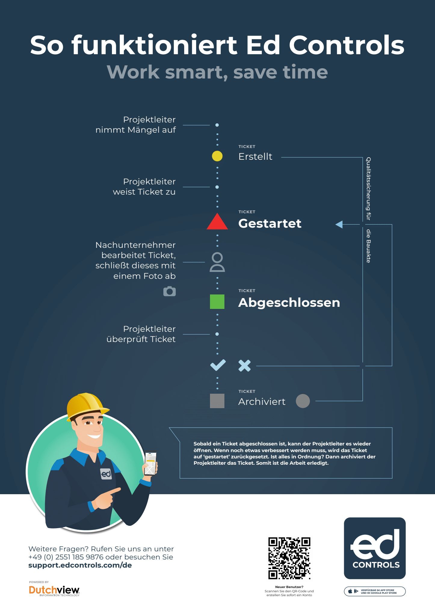 Hinweise; Das untenstehende Poster, das auch heruntergeladen werden kann, zeigt den Ablauf des Tickets. Auf diese Weise kann ein Hauptverantwortlicher oder der Support des Baupartners leicht erklären, was die Idee des Workflows im Zusammenhang mit dem Ticket-Modul ist.