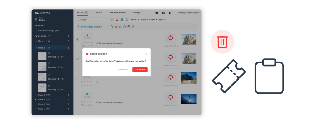 Zweitens können Vertragsadministratoren jetzt Audits und Tickets löschen, die älter als 14 Tage sind, auch wenn sie bereits abgeschlossen wurden. Dies gibt Ihnen die Möglichkeit, Fehler zu korrigieren, unangemessene Inhalte zu entfernen oder Ausnahmen zu verwalten. Auf diese Weise entfernen Sie ungenaue oder unvollständige Audits und Tickets, erhalten die Integrität Ihrer Projekte und können flexibel auf veränderte Umstände reagieren.