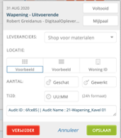 Ticket abgeschlossen (grüne Quadrat): Hier hat der Verantwortliche für das Ticket seine Arbeit abgeschlossen. Er/sie meldet diesen Vorgang, indem er/sie das Ticket als abgeschlossen markiert und die Arbeit mit einem Foto dokumentiert.